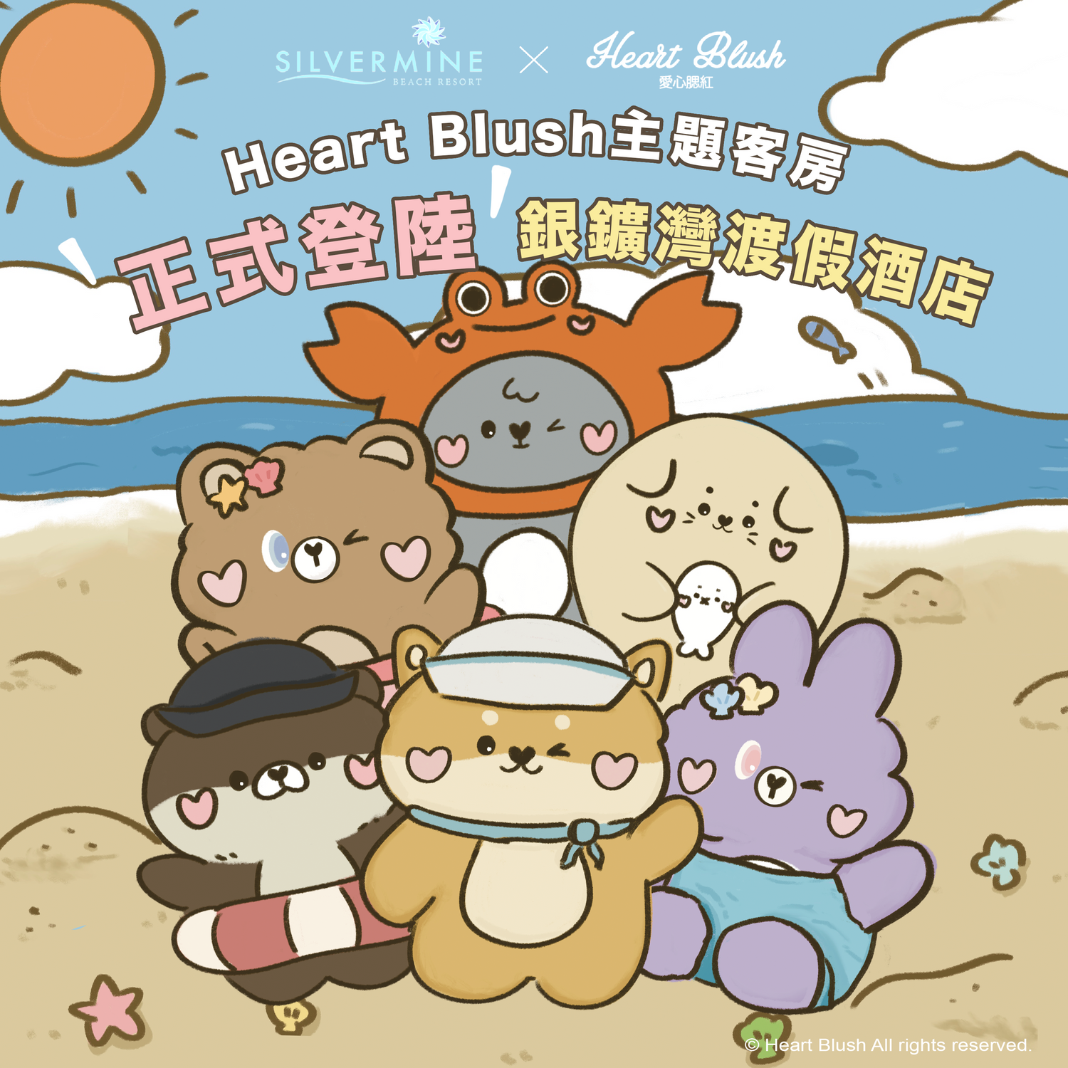 銀鑛灣渡假酒店首次聯乘本地原創IP Heart Blush愛心腮紅 @heart.blush,推出主題客房!集合6隻可愛小動物主角,包括:小熊Koubbi、小兔Miiona、柴犬Beruu、小狗Bokki、無尾熊Ulaa、水獺Giloh六位主角換上可愛的裝備,齊齊去銀礦灣渡假酒店探險